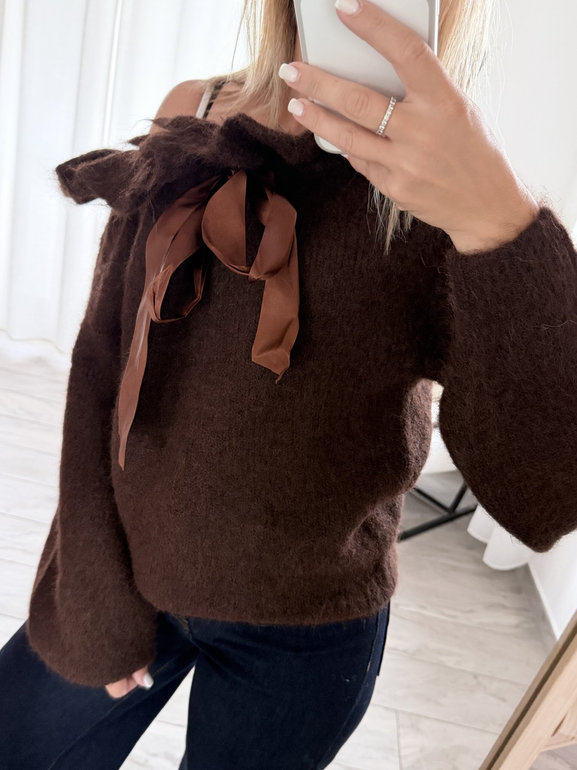 Col bateau, le pull peut se resserrer à l’aide des deux rubans afin de le faire remonter sur les épaules.