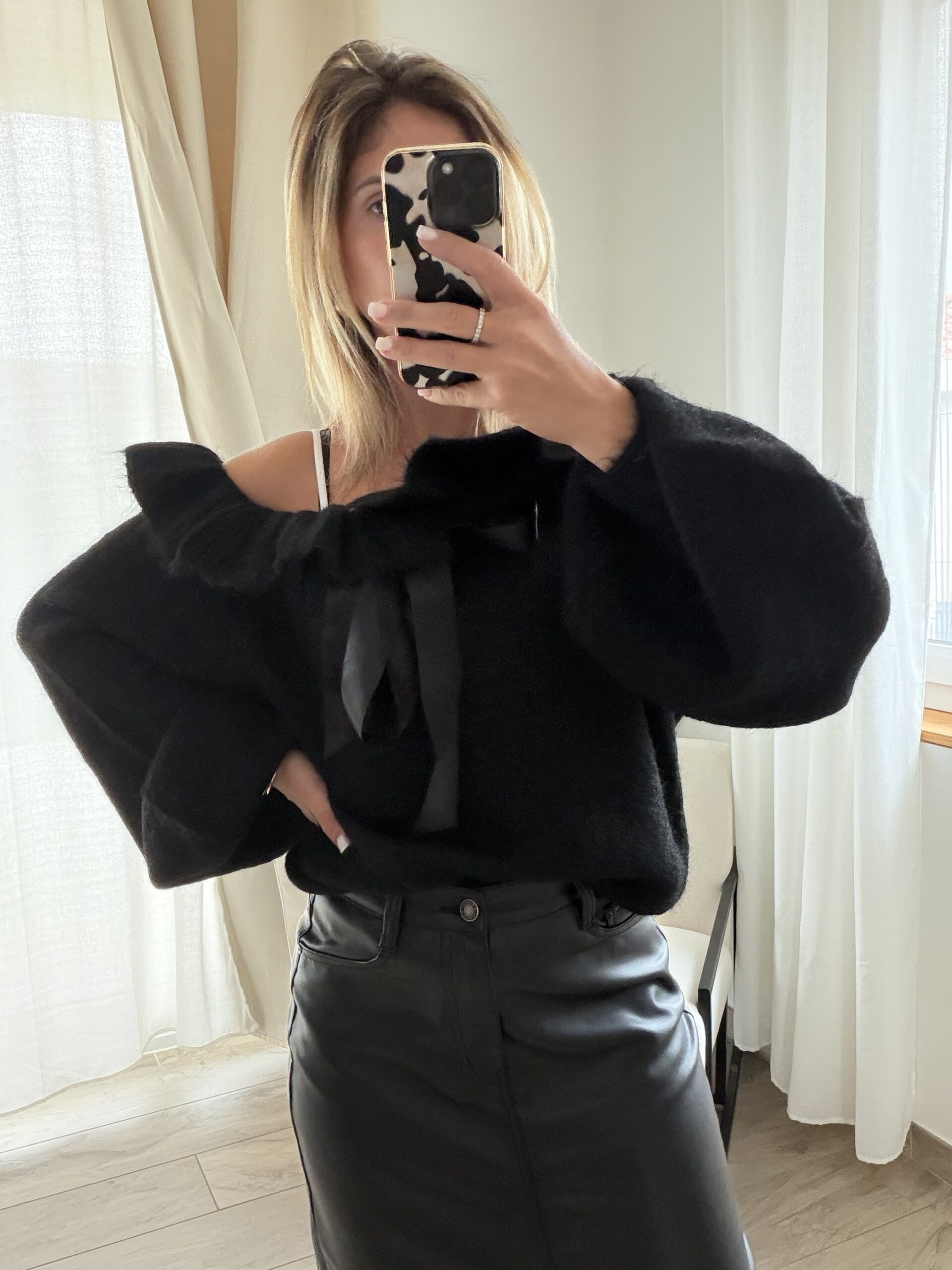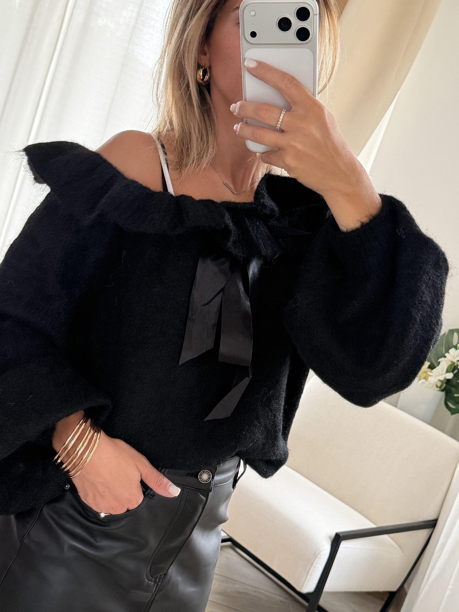 Col bateau, le pull peut se resserrer à l’aide des deux rubans afin de le faire remonter sur les épaules.